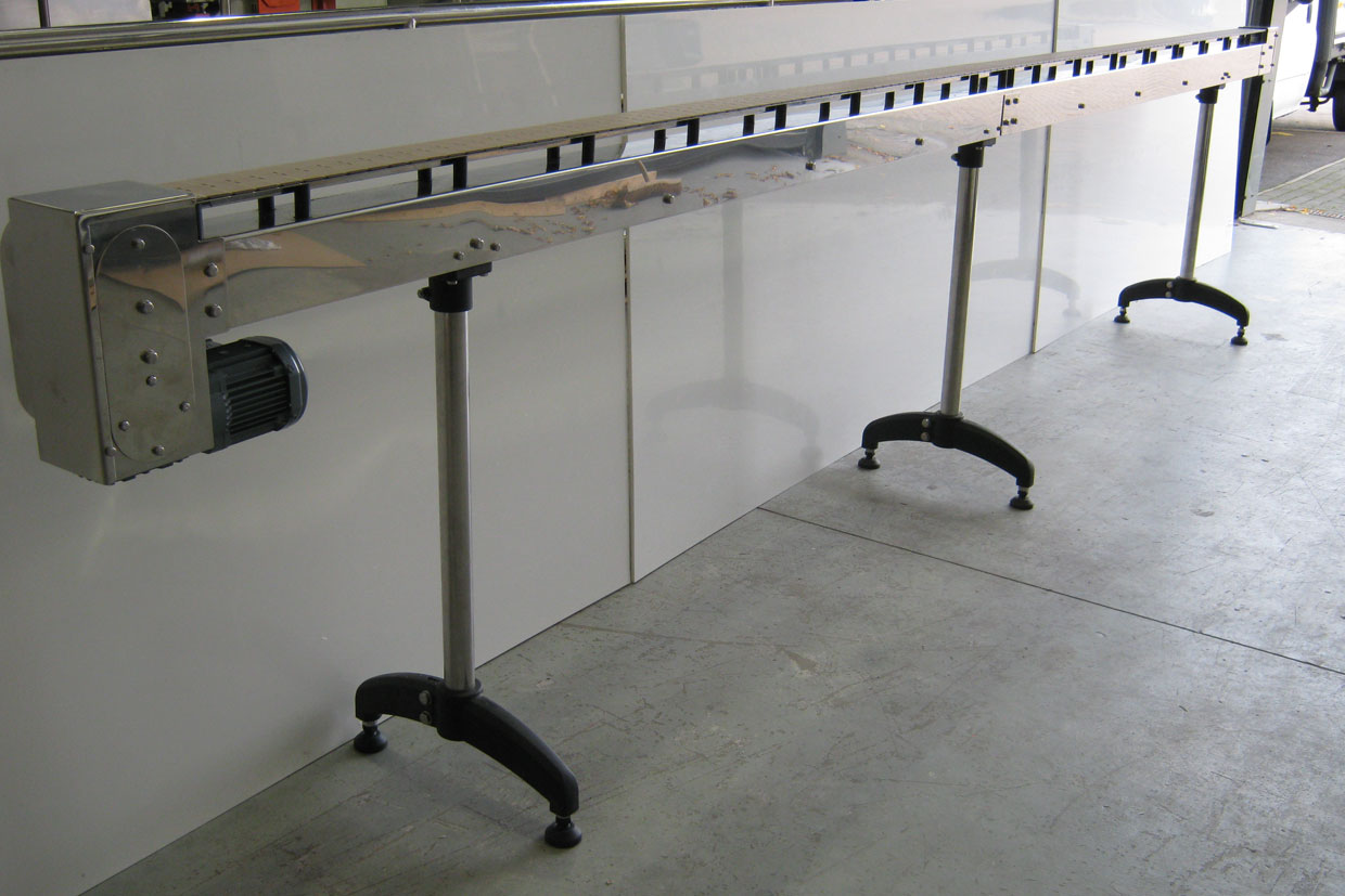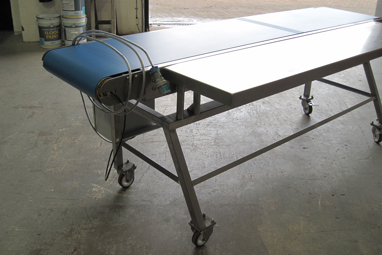 A good example of a polished stainless steel conveyor system we developed which was portable and allowed height adjustment.